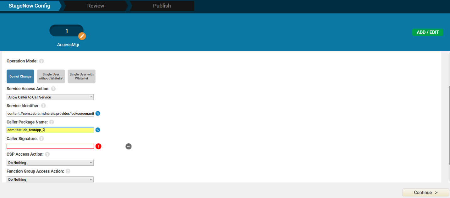 For information on generating a signature file, see Caller Signature in the Access Mgr CSP documentation. After creating the StageNow profile, use StageNow to scan the generated barcode or deploy the XML file via Enterprise Mobility Management (EMM) software.