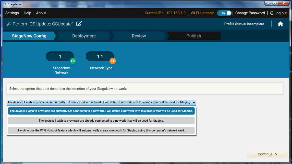 If connecting to this network using StageNow barcodes, click "Yes" and click "Continue" to proceed (see Profiles / Connect Network for instructions on connecting to a network and populating the settings window).