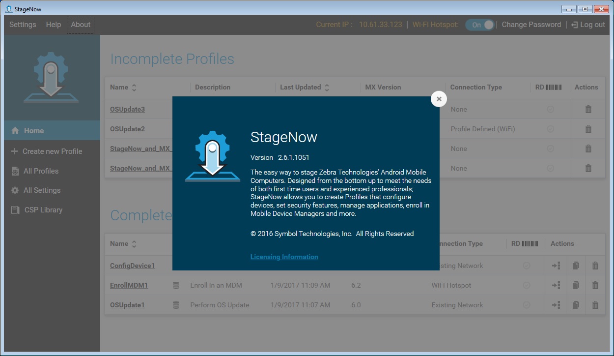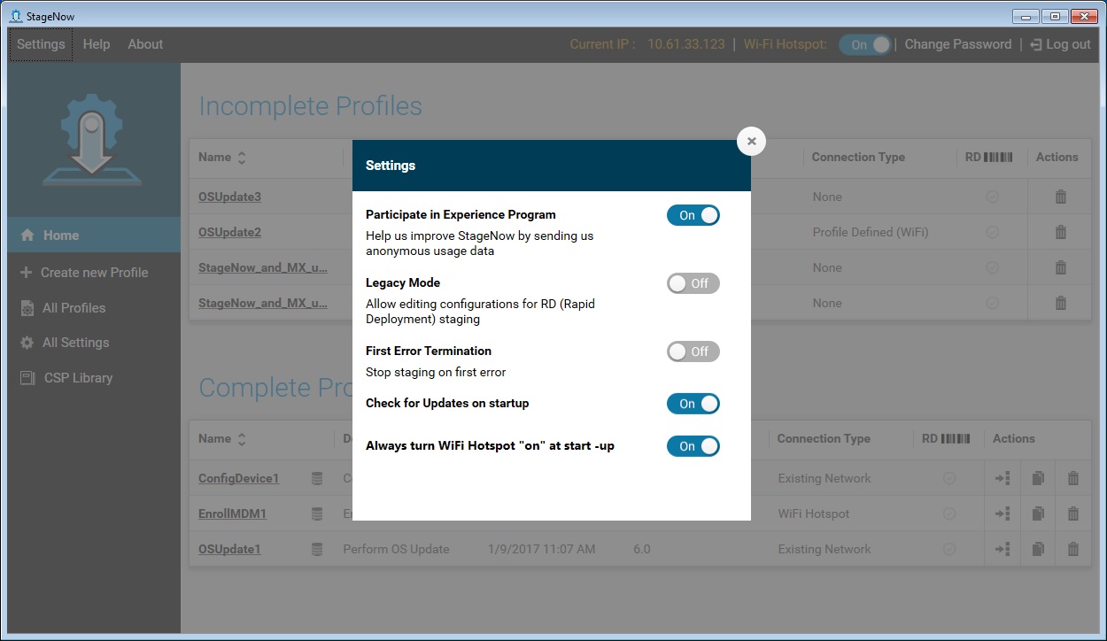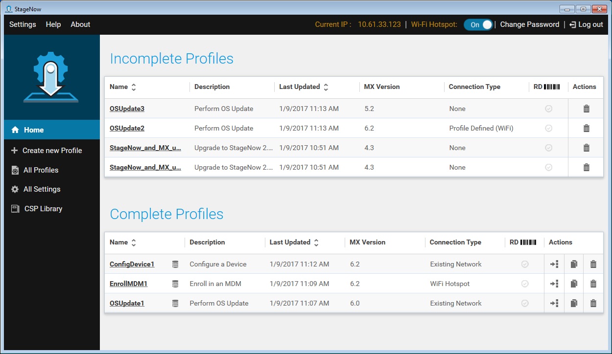 Note: The tool's built-in staging server is an FTP server to which devices download the staging content of the deployment section, files selected for download from the remote server, and RD staging files. Because multiple applications cannot use Port #21 (usually used by FTP servers) at the same time, administrators must ensure the Workstation Tool PC does not have another FTP server running in the background (or that it uses a different port). The staging (FTP) server runs only when the tool is running, and stops when the application closes. Therefore StageNow must be running when staging the device with profiles as described above.