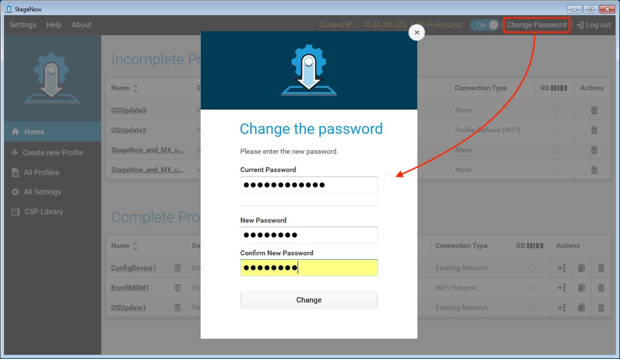 1. Click Change Password in the upper right corner of the Home Screen to set a new administrator password for access to StageNow: