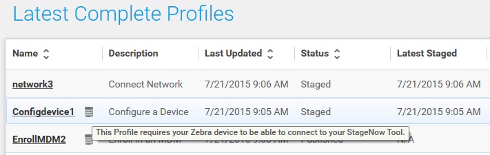 Name - Administrator-provided name of profile. Profiles requiring the client device to be connected to the staging server appear with a Server Icon appended to the profile name.