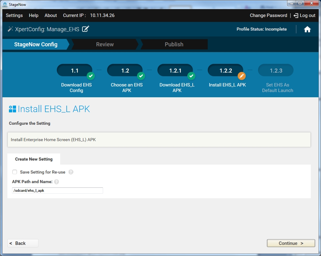 Select the type of APK to install and select Continue. Refer to the EHS documentation for device and EHS APK mappings.