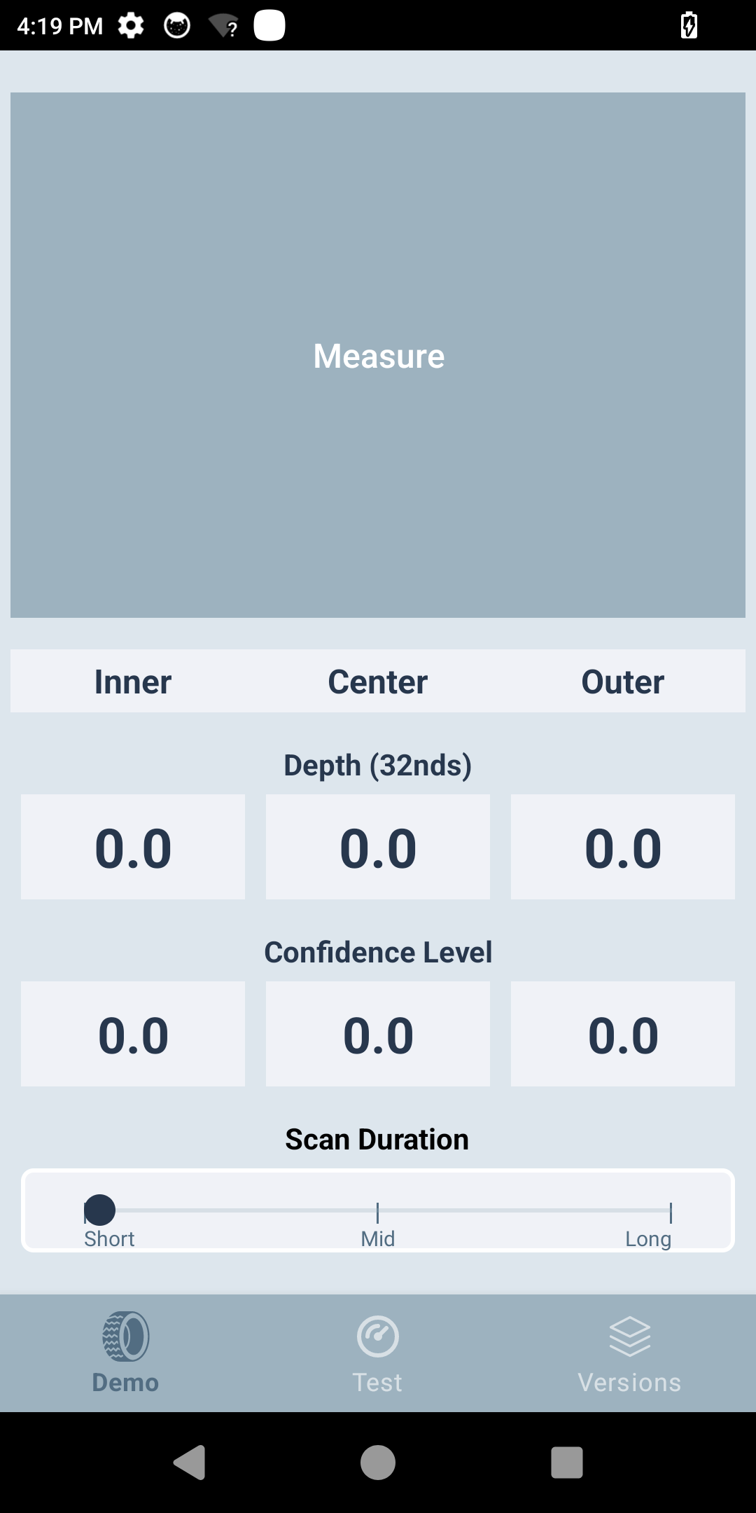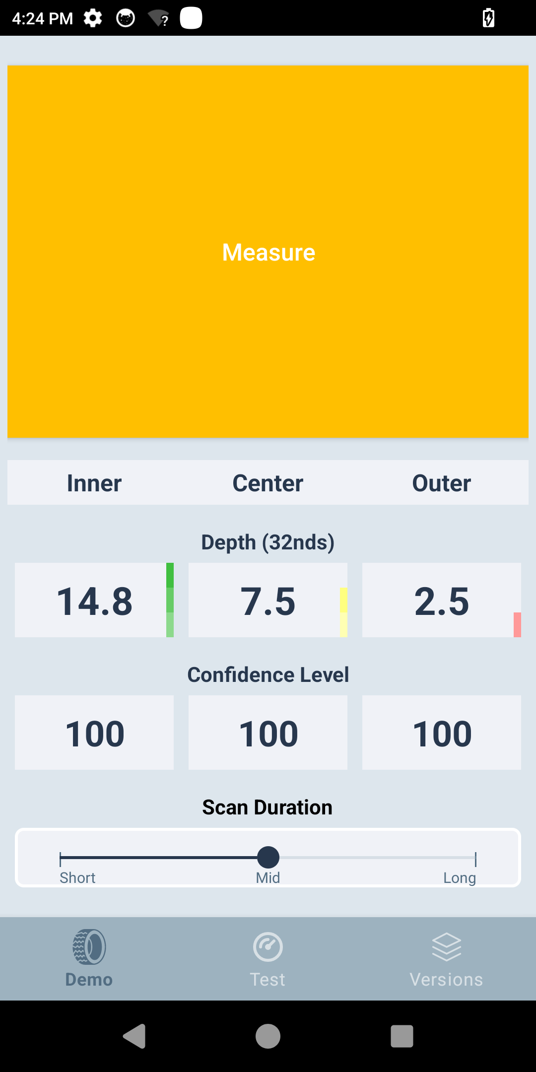 - Tap the Measure button and swipe the device across the tire from edge to edge. When the read is successful, measurements are displayed along with their corresponding confidence levels. If the confidence level below 60, a prompt will appear to re-swipe.