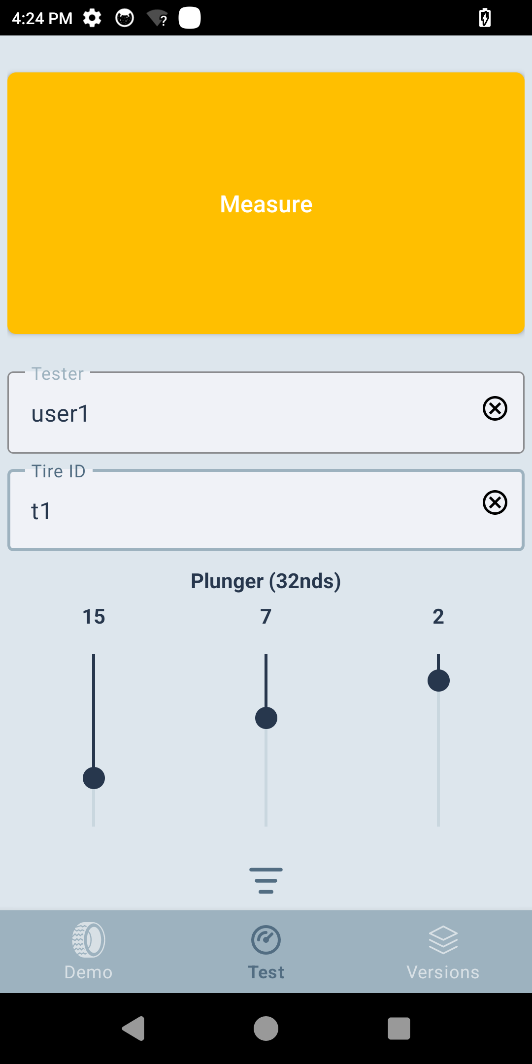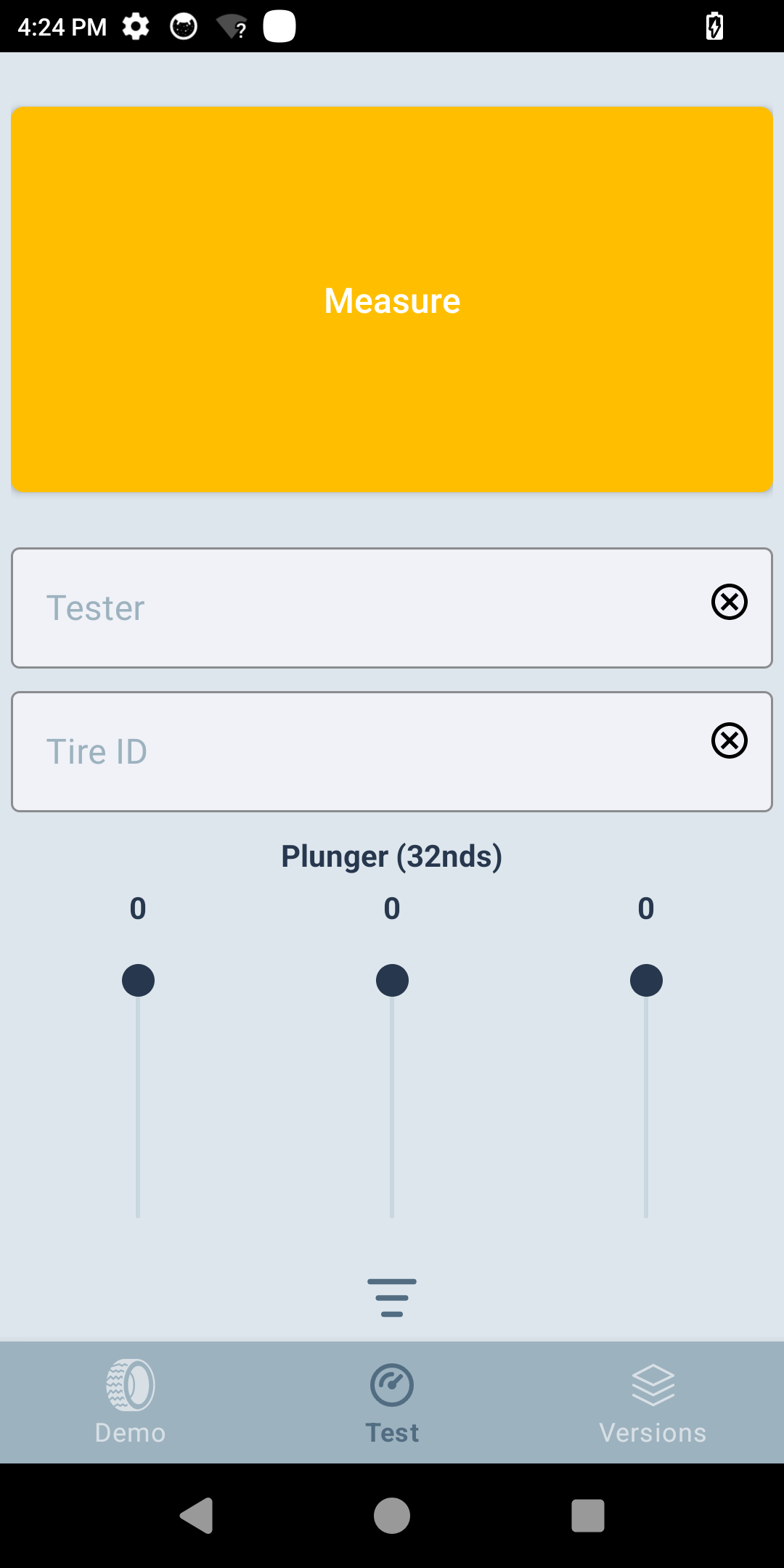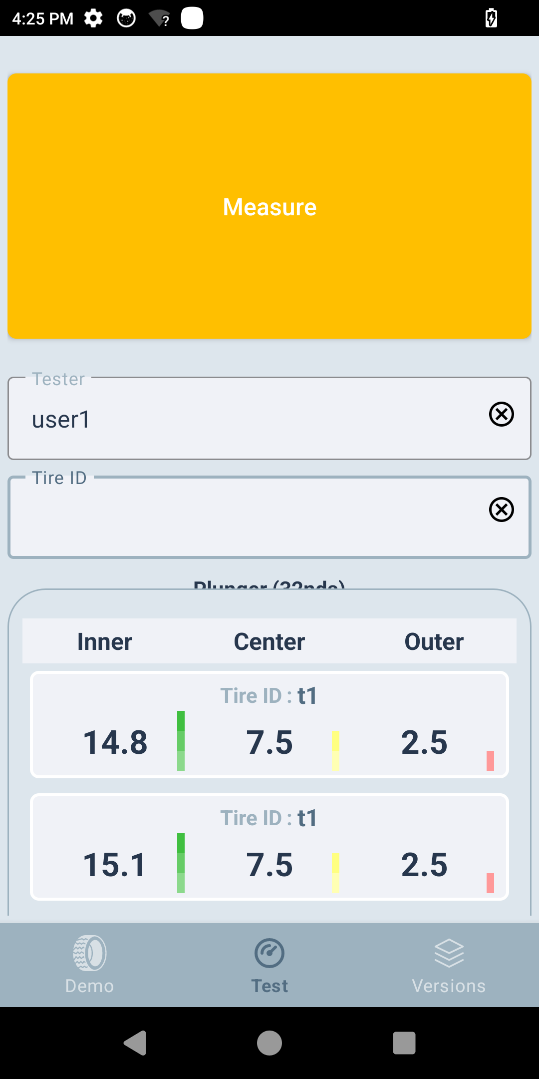 Enter the Tester ID and Tire ID. Adjust plunger values for the inner, center, and outer tire regions as needed. Enter these values based on manual measurements. The app does not rely on plunger measurements to continue operation; however, capturing them can be helpful for later analysis or debugging.