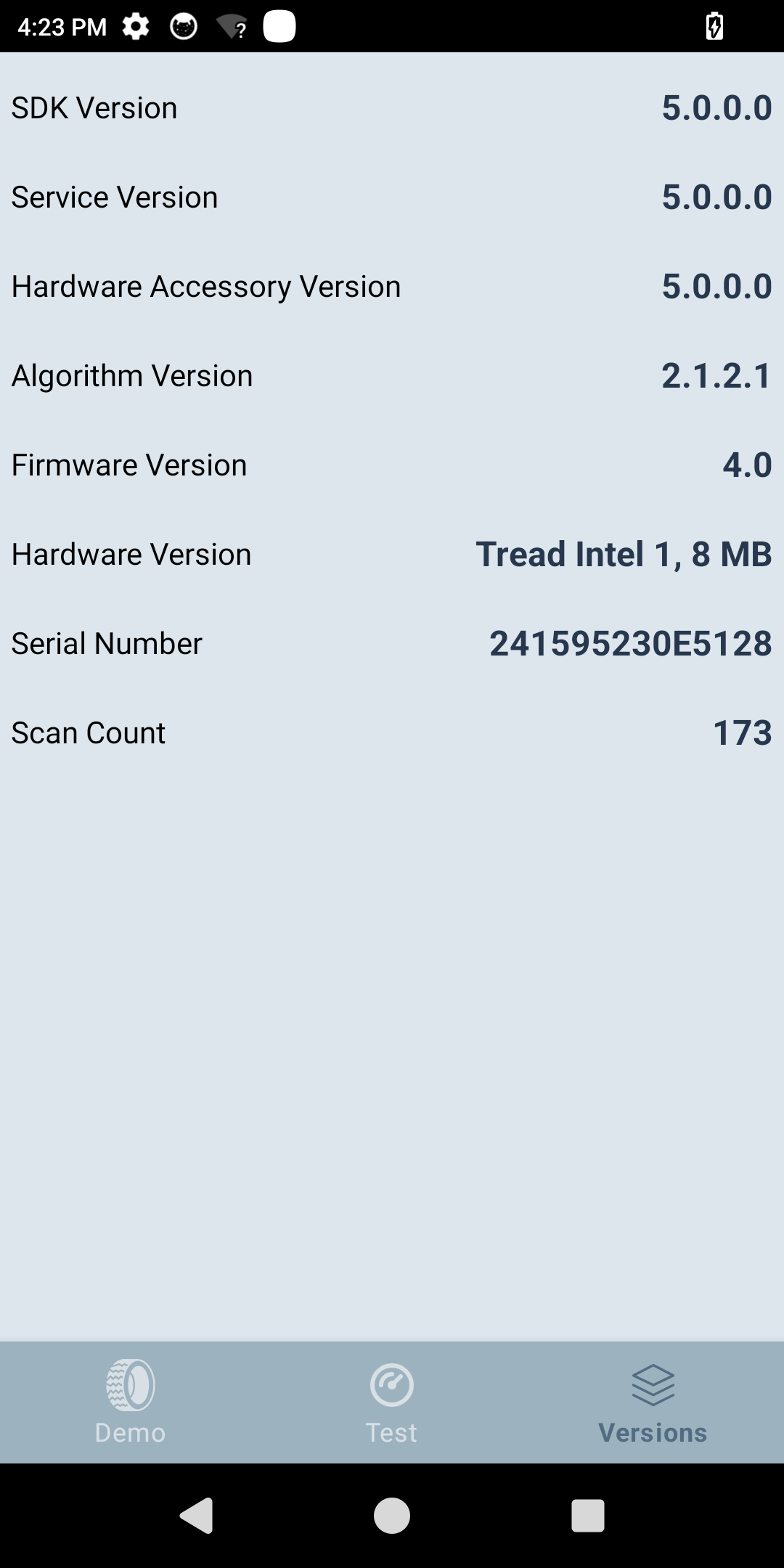 The Versions tab in the app displays the software component versions of the reader, as well as the reader serial number and the scan count, which is the total number of scans performed by the reader.