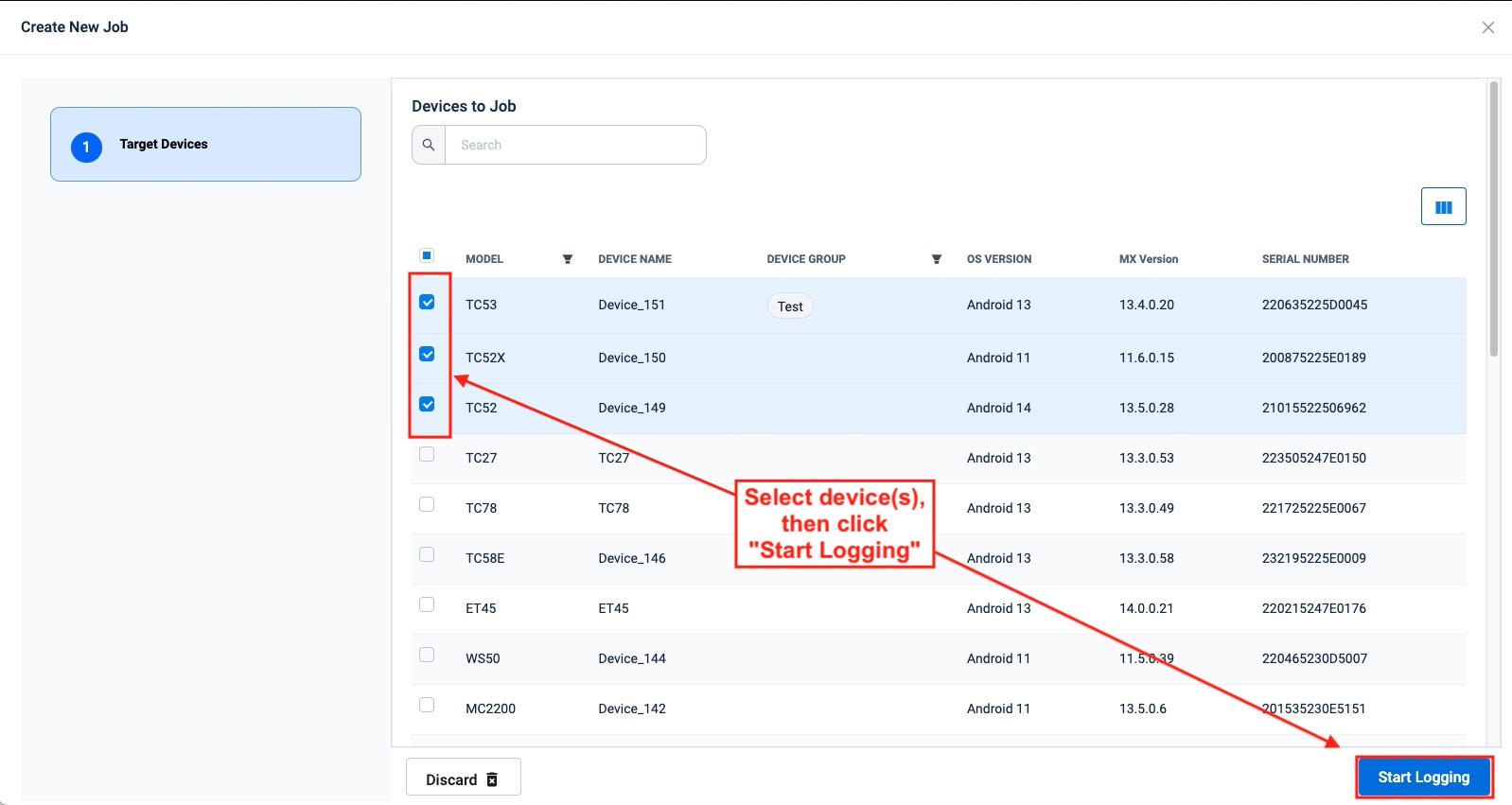 Click "Start Logging" to begin capturing logs from selected devices: Click image to enlarge; ESC to exit.