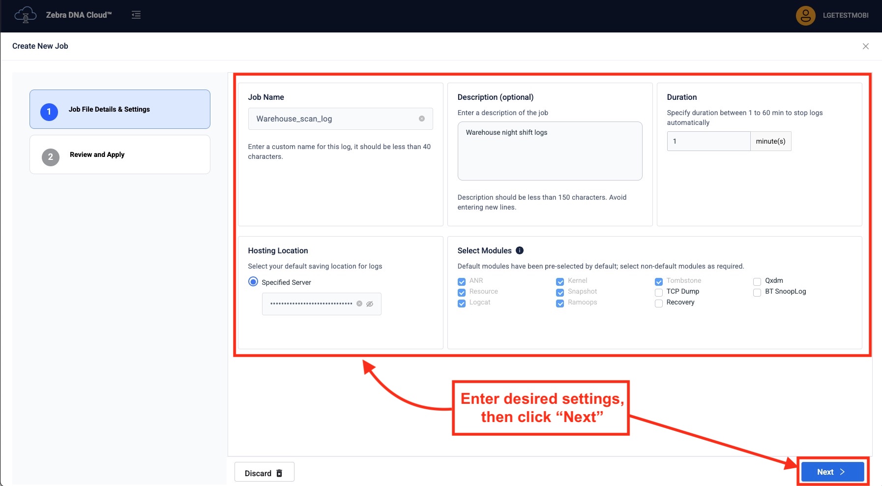 Enter information for the job, where to save collected data and the collection modules to enable: