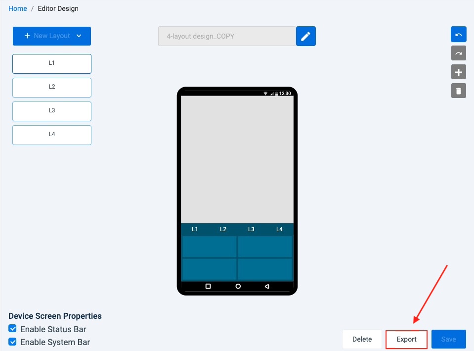Select "Export" from the EKB Design Studio Home screen or the Design Editor screen (shown below).
