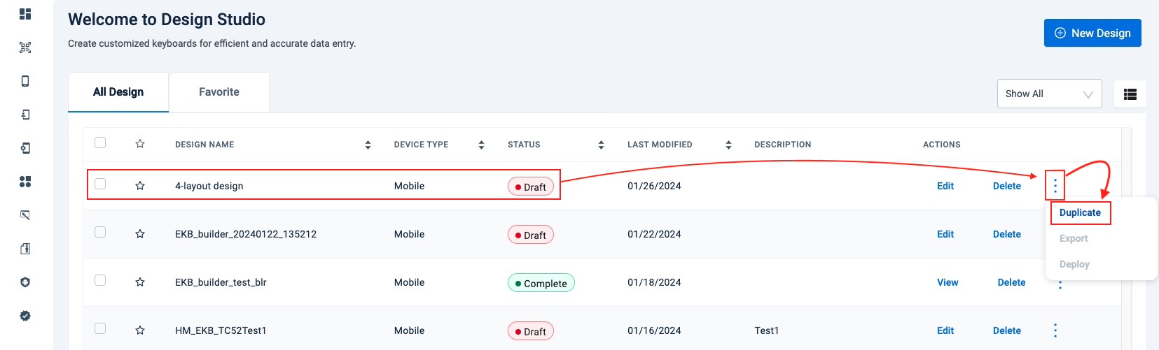 Enterprise Keyboard Design Studio is a cloud-based tool within the ZDNA console for creating customized key layouts to enhance an application and promote efficient and accurate data entry. Layouts created with EKB Design Studio work on Zebra Android devices that use Zebra's Enterprise Keyboard (EKB) 4.1 (or later), and can be displayed programmatically using Android intents or through DataWedge 7.4.4 (or later).
