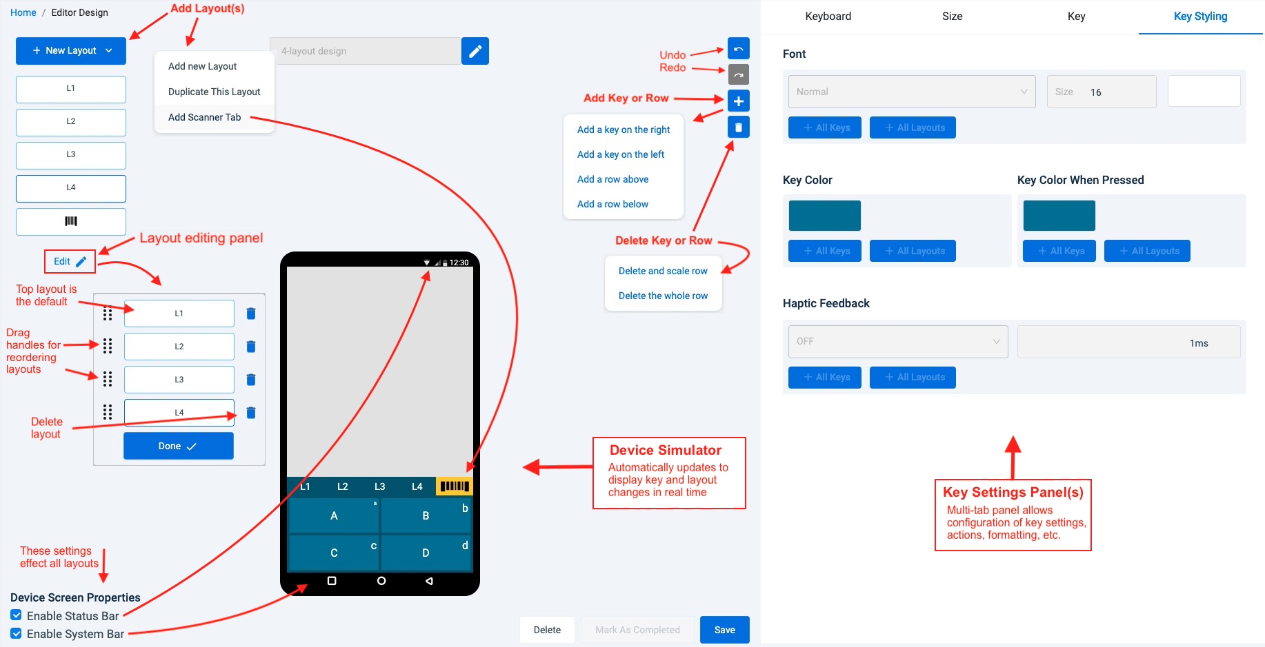 Each design can deliver as many as six (6) key layouts to a device, each of which can be customized according to business needs and invoked when specific input situations arise (see below). DNA Cloud licensees can create an unlimited number of designs*, but a device can contain no more than one (1) design file at a time. Once finalized and marked as "Complete," designs can be deployed across an enterprise using ZDNA, Zebra StageNow or a company's own EMM system.