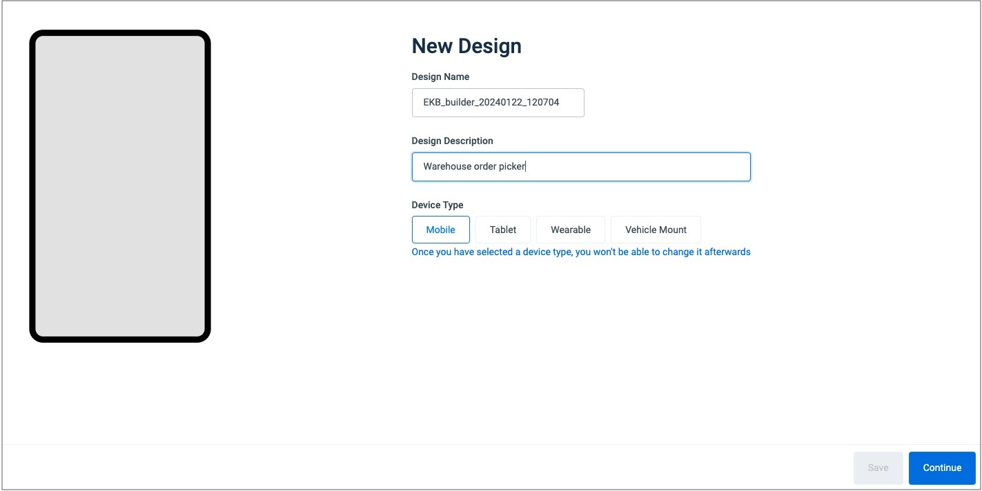 Enter a name (or accept auto-generated default). Add a brief description and select the device type and click “Continue” to proceed.