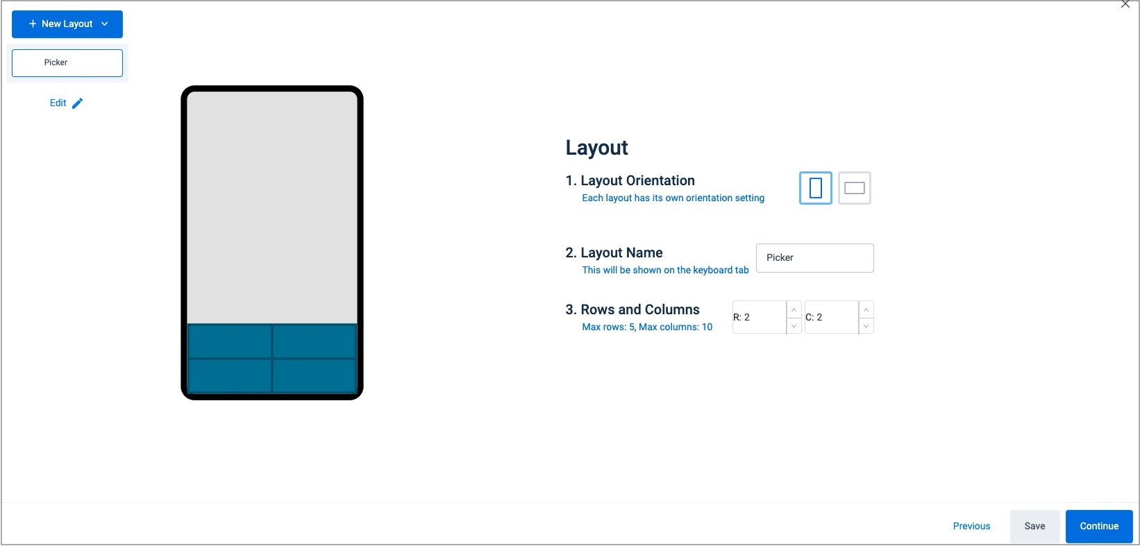 Select intended orientation, layout name* and grid dimensions and click “Continue” when finished.