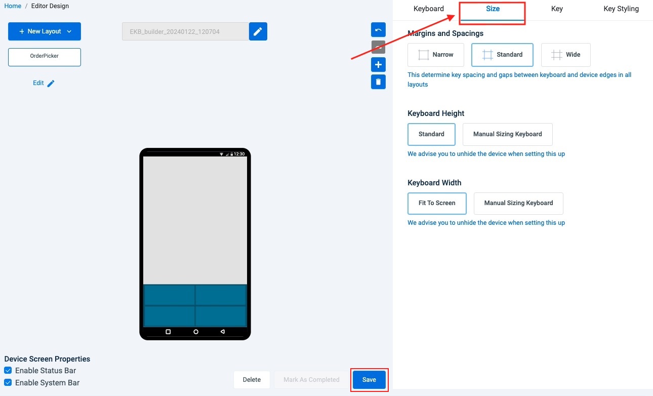c. Keyboard Width (select "Size Manually" to drag width in simulator)