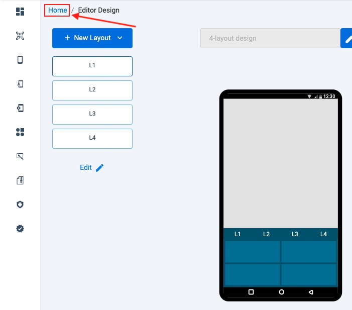 - In the layout editing panel the upper-most layout is displayed by default when the design is invoked on the device.