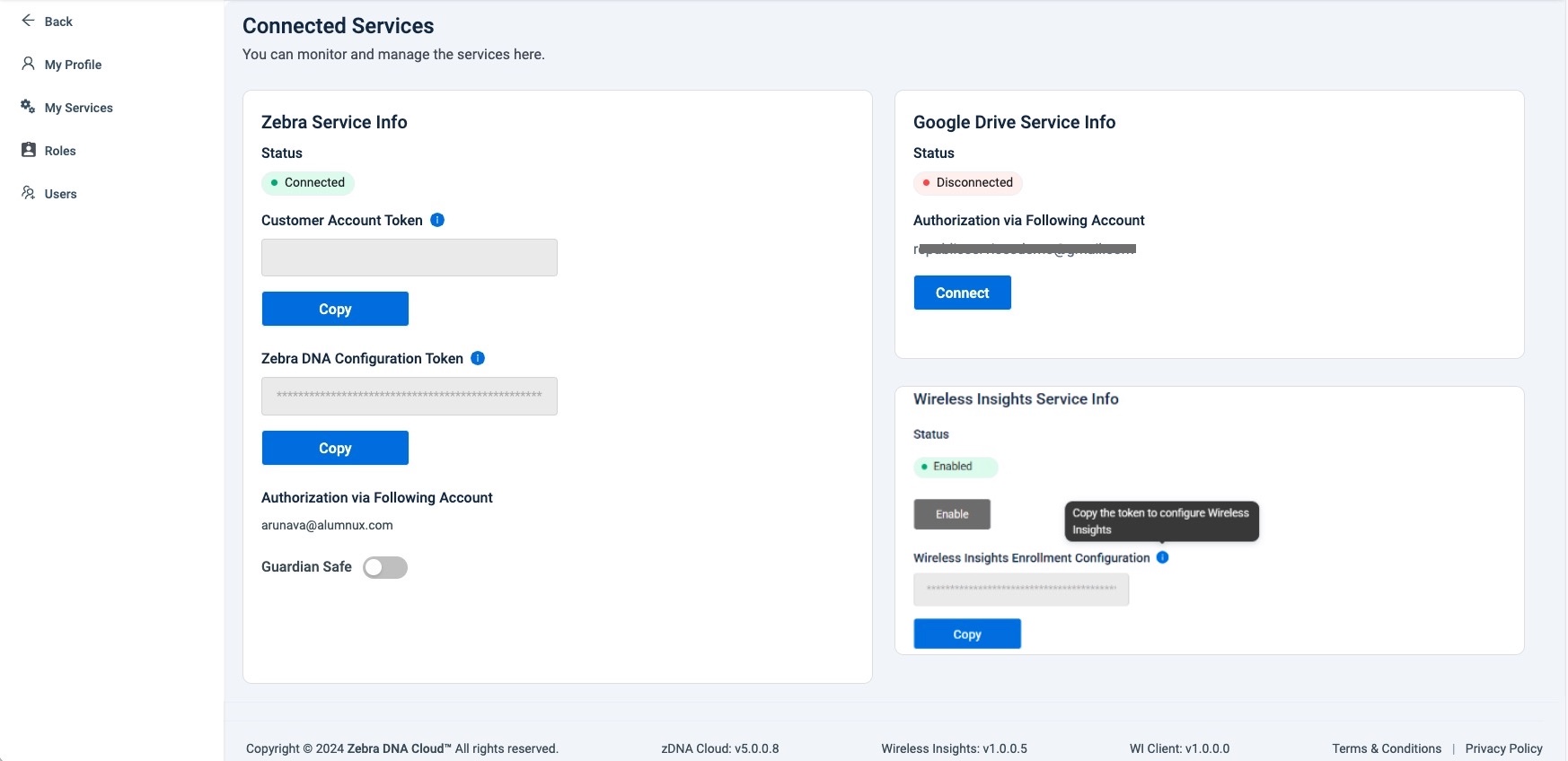 DNA Cloud's Wireless Insights Dashboard requires the Zebra Wireless Insights agent to be present on all devices from which wireless data is to be extracted. There's also a one-time configuration change in the "My Services" section of the DNA Cloud console. Details are below.