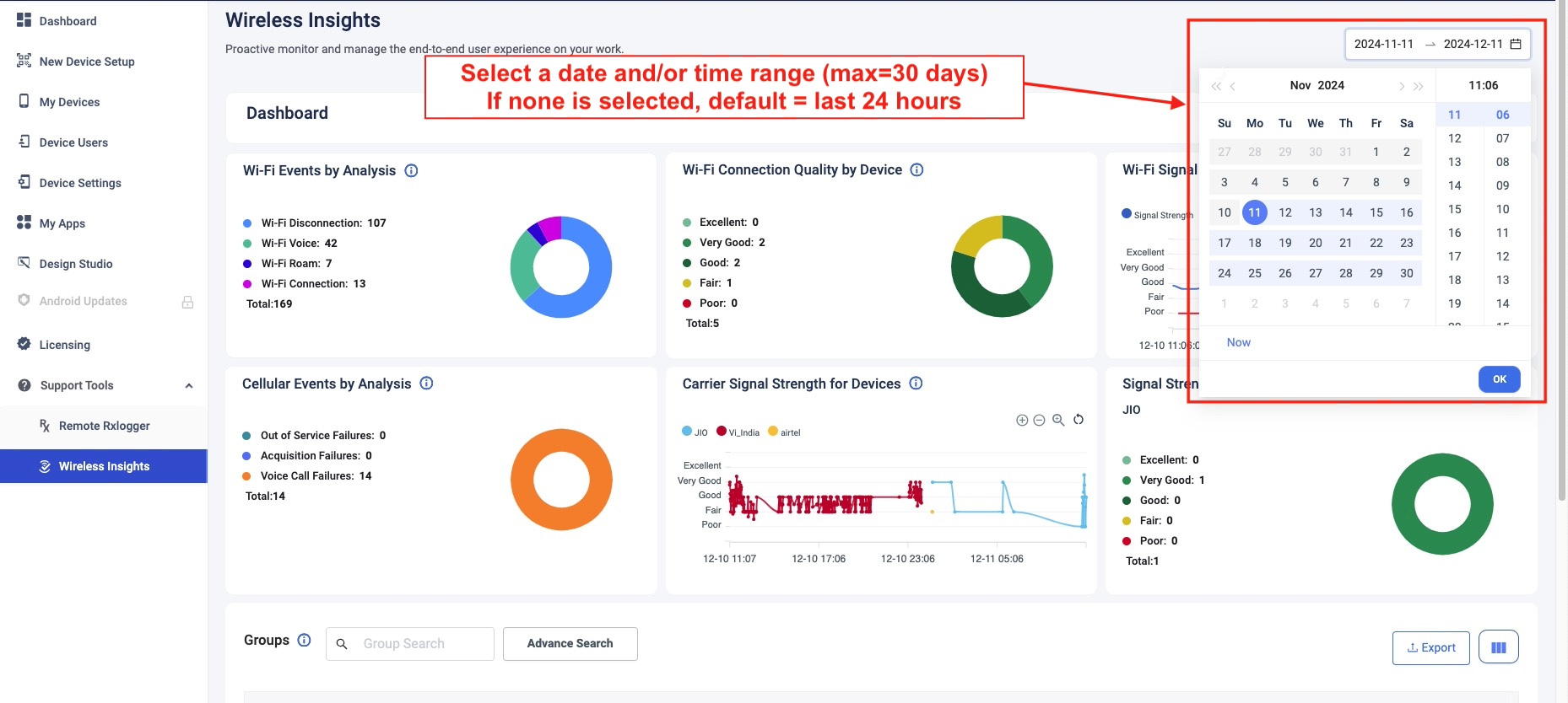 Click the date selector to analyze wireless data for a particular date and/or time range (max. = 30 days):