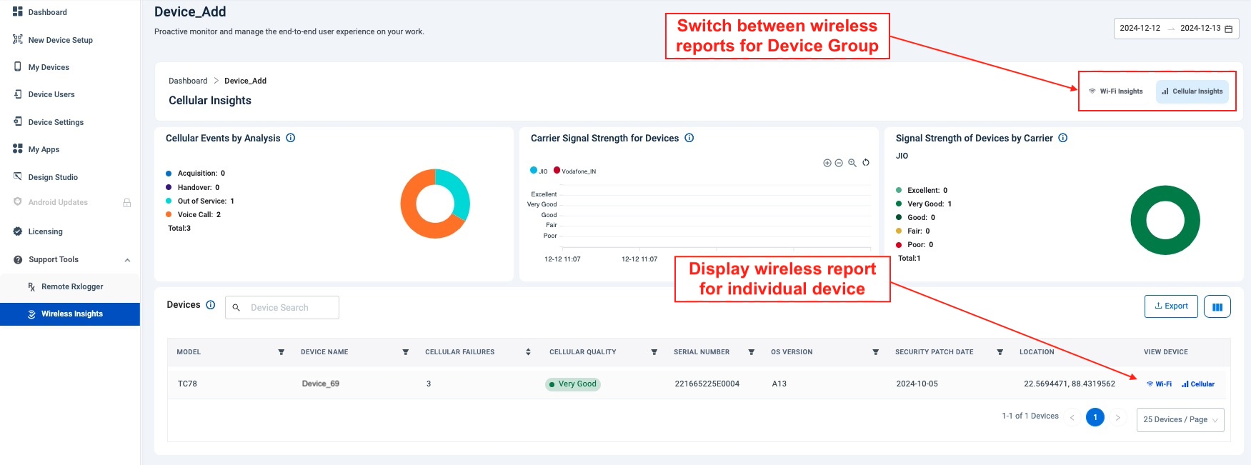 The Wireless Insights dashboard shows real-time Wi-Fi (top row) and cellular performance for active devices.