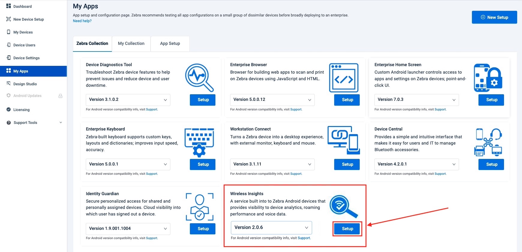To install the Wireless Insights agent, click the "Setup" button in "Wireless Insights" tile of the Zebra Collection.