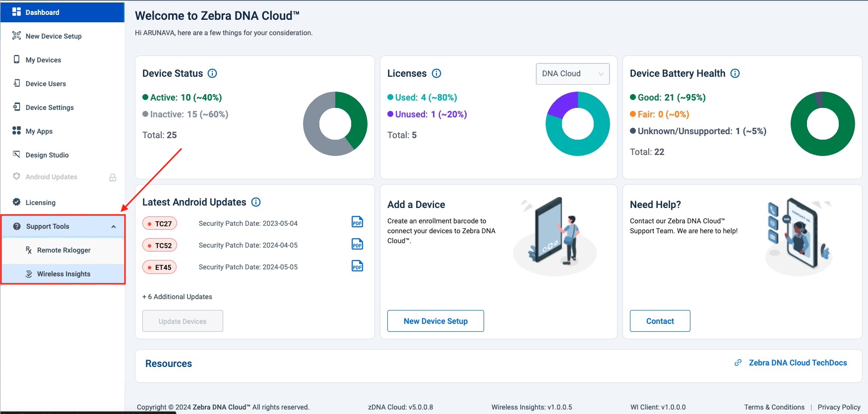DNA Cloud's Wireless Insights Dashboard requires the Zebra Wireless Insights agent to be present on all devices from which wireless data is to be extracted. There's also a one-time configuration change in the "My Services" section of the DNA Cloud console. Details are below.