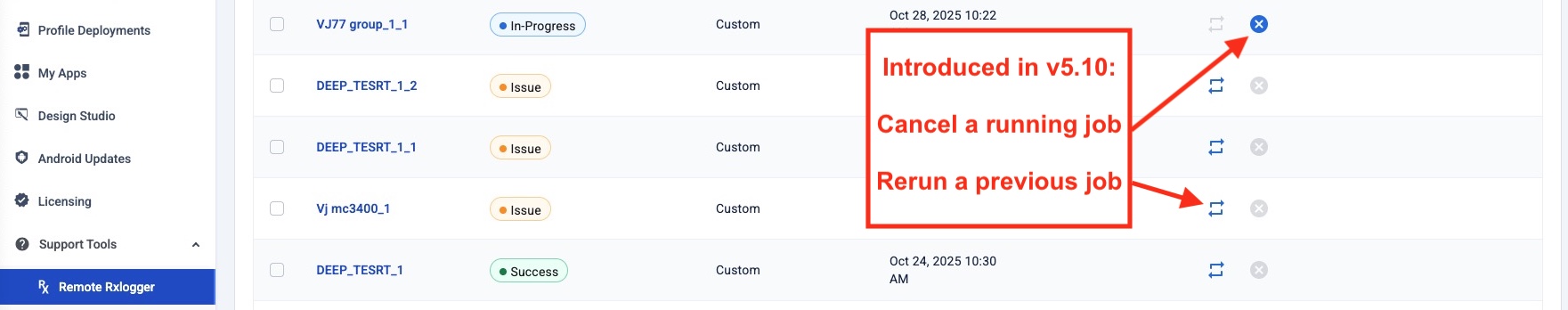 To rerun a previous job or cancel* a running job: Click the corresponding Action from the RxLogger main screen: